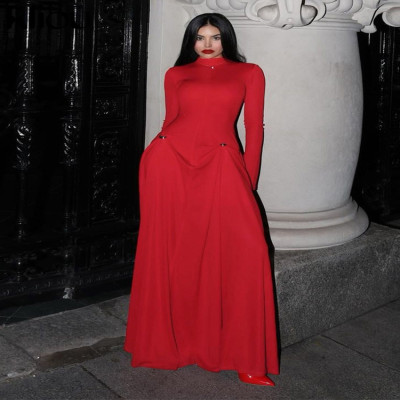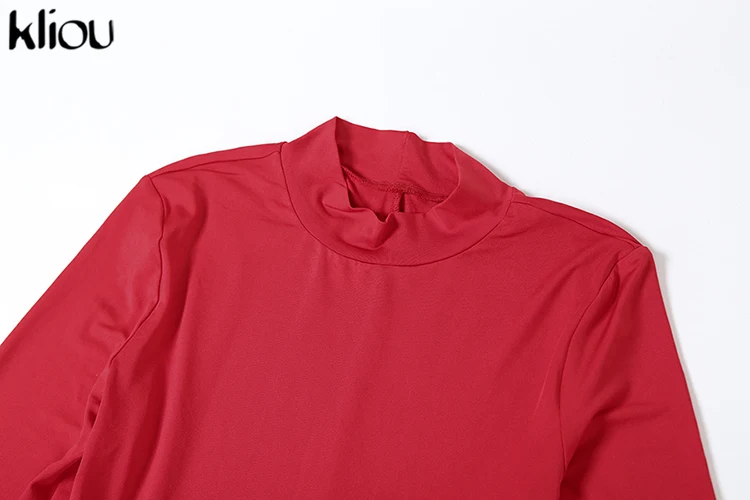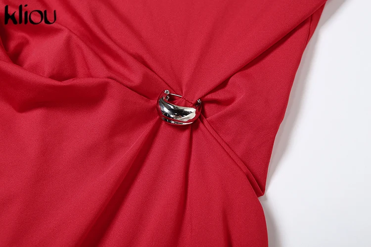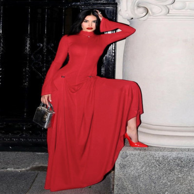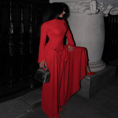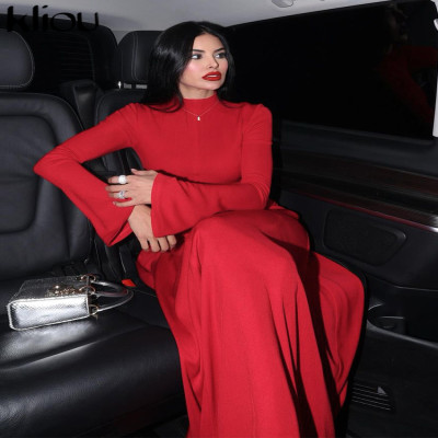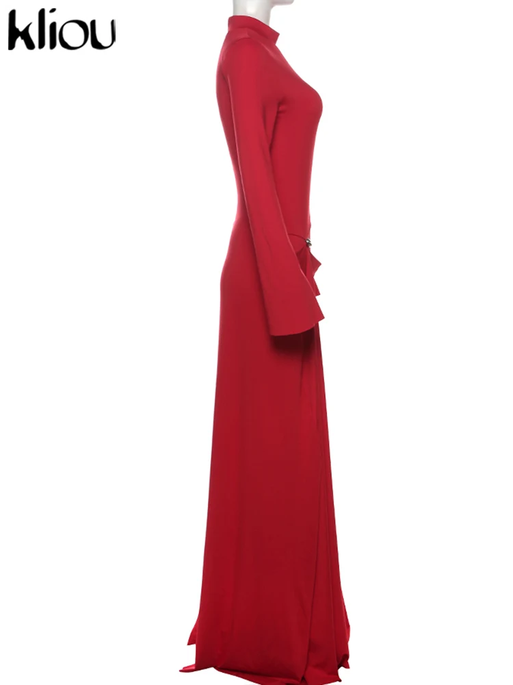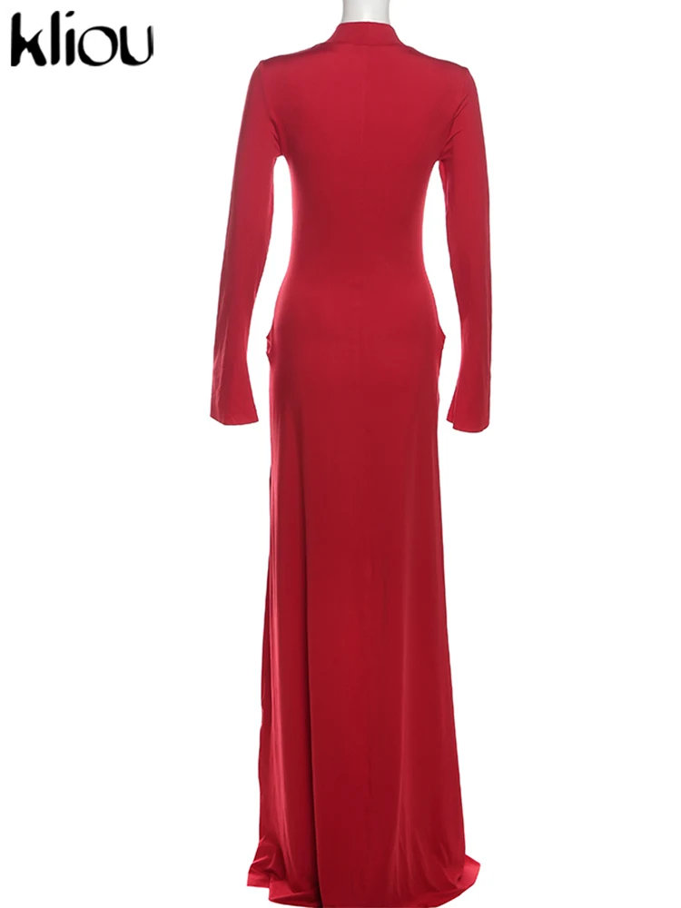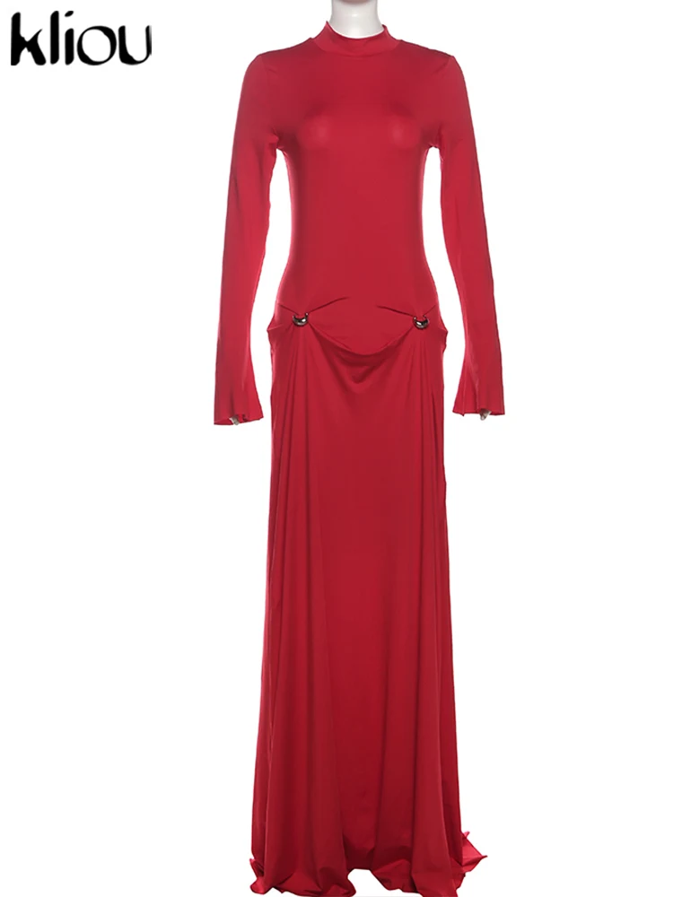 فستان ماكسي نسائي أنيق من Kliou موضة كلاسيكية بأكمام كاملة وياقة واقفة ثنيات غمد طويل رداء Mujer فساتين سهرة موجزة