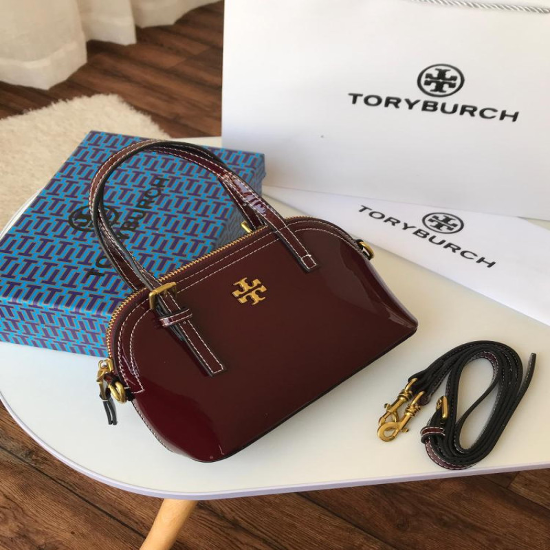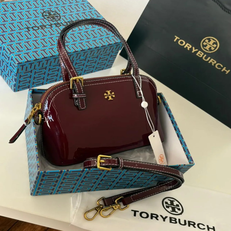 شنطة توري بورش Tory Burch طبق الأصل مصنوعة من الجلد اللامع الفاخر بلون عنابي جذاب مع ت...