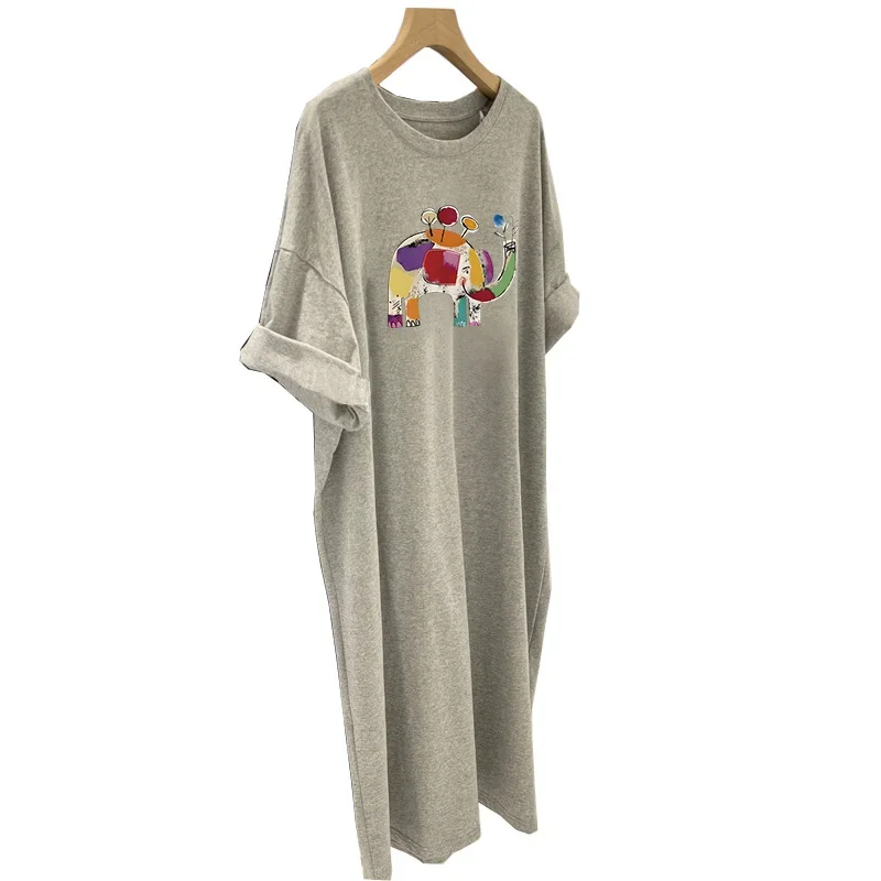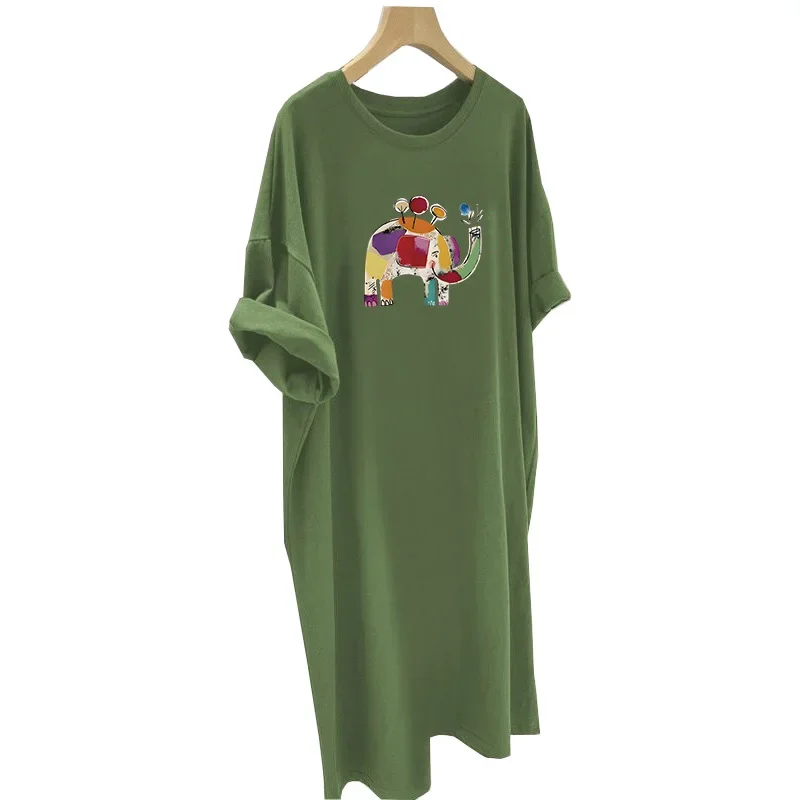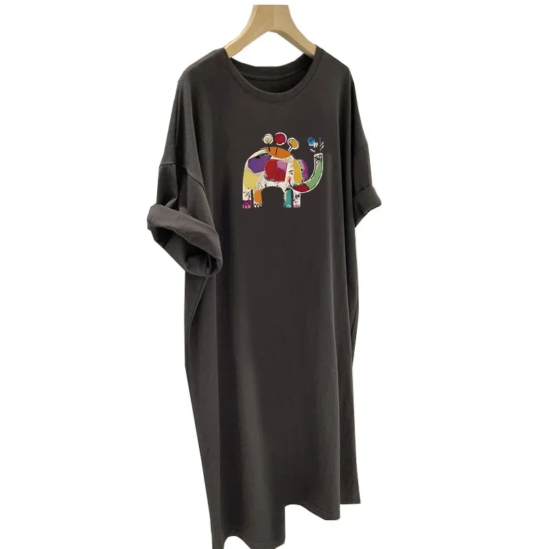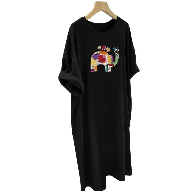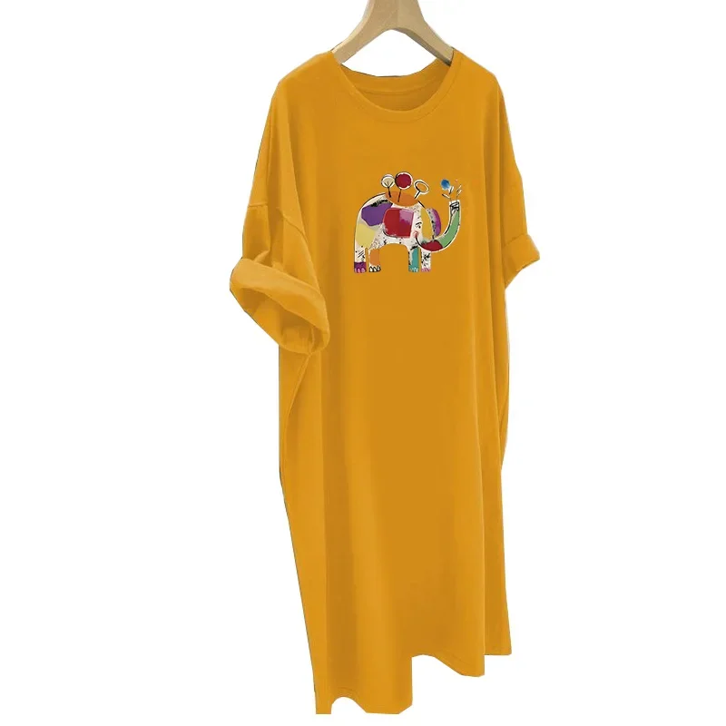 ملابس النساء خمر البلوفرات قصيرة الأكمام فساتين الكرتون المطبوعة طول الركبة سترة الصيف فستان كاجوال فضفاض