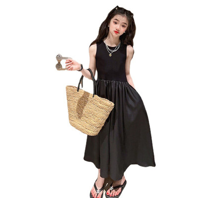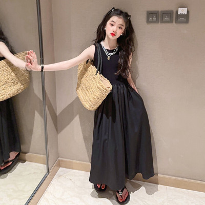 فساتين الفتيات 2024 جديد عصري الفتيات الصيف الراقية الأسود الصلبة فستان طويل للأطفال الصيف سترة دون أكمام فستان