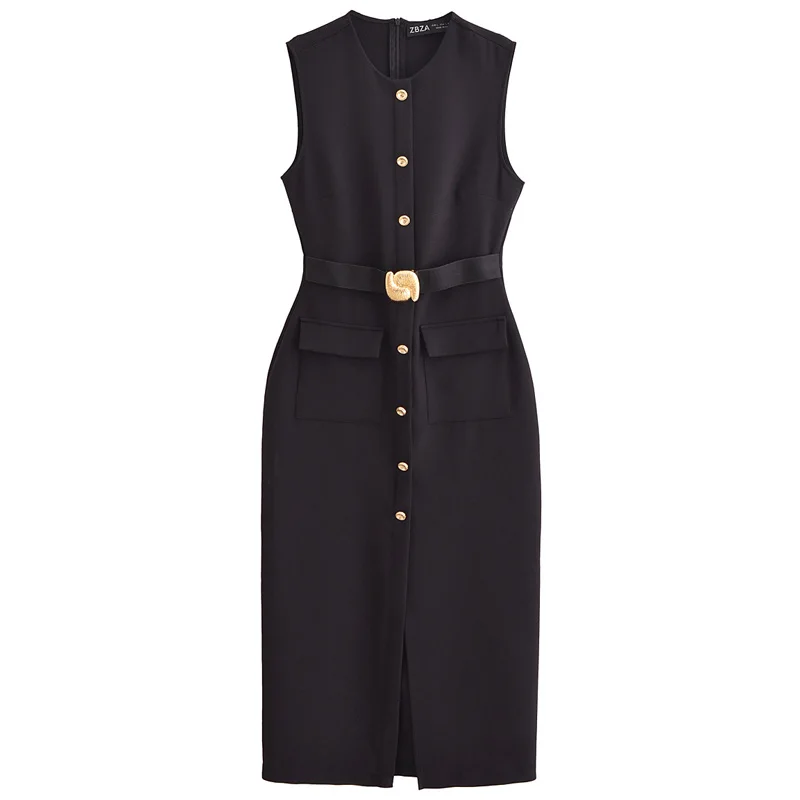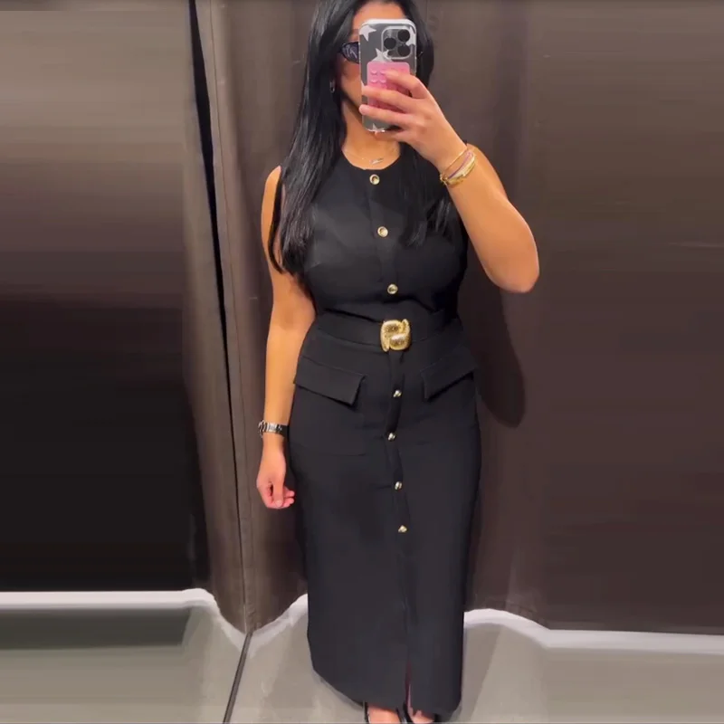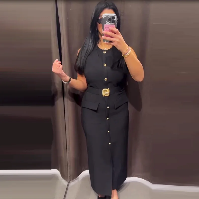فساتين نسائية من TRAF فساتين سوداء طويلة لصيف 2025 بدون أكمام وأزرار وحزام فستان صيفي جديد في فساتين فستان سهرة مثير