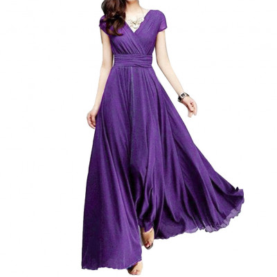 فستان سهرة ماكسي نسائي بوهيمي بلون واحد وأكمام قصيرة ورقبة على شكل V وخصر ضيق