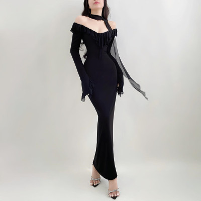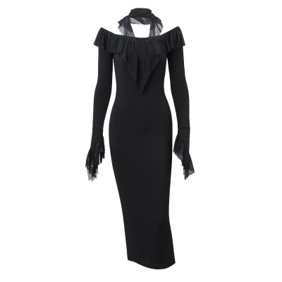 فستان سهرة أنيق بكشكشة شبكية من Xeemilo بياقة دائرية وأكمام طويلة فساتين ماكسي أنيقة للنساء رداء نادي الحفلات