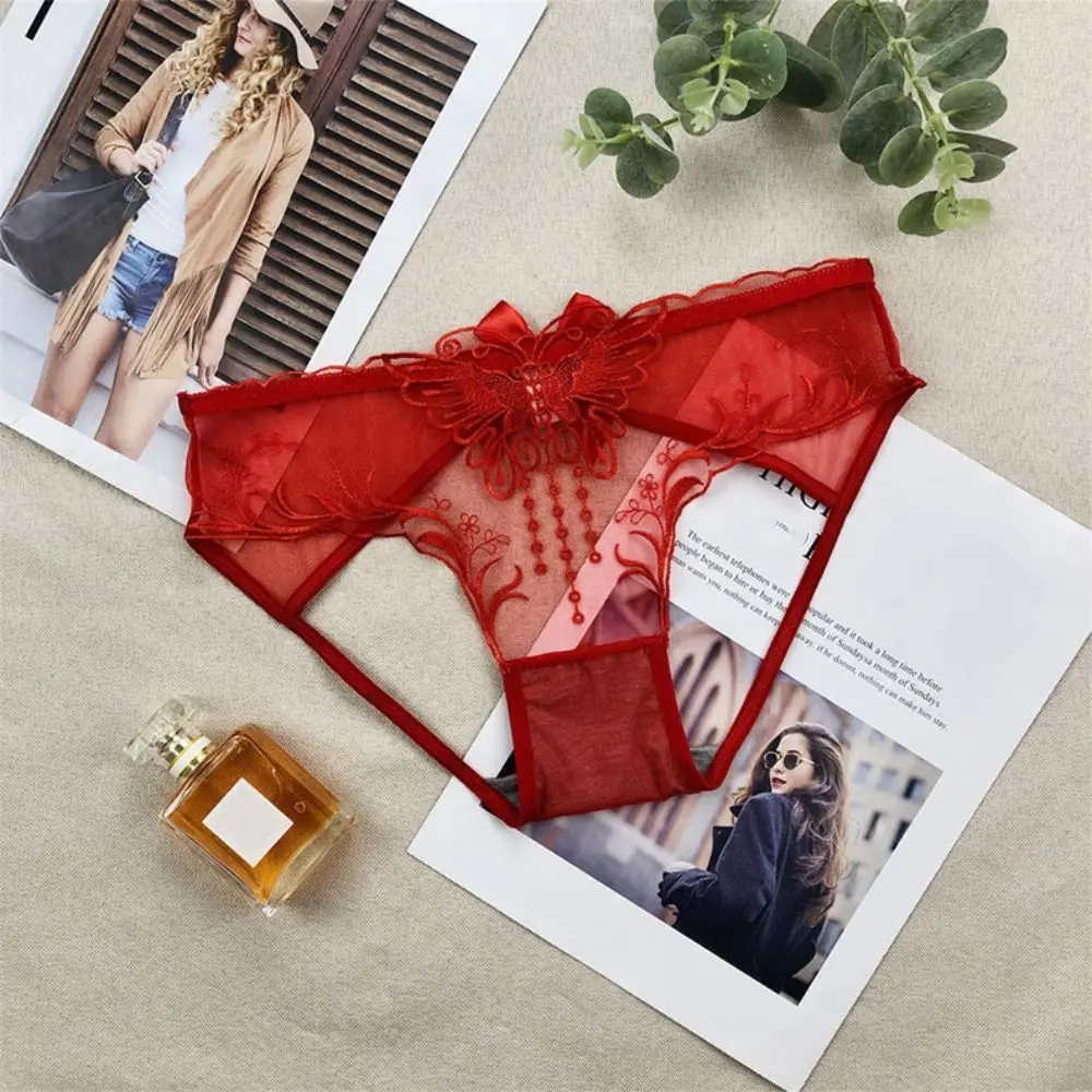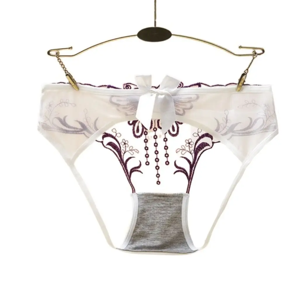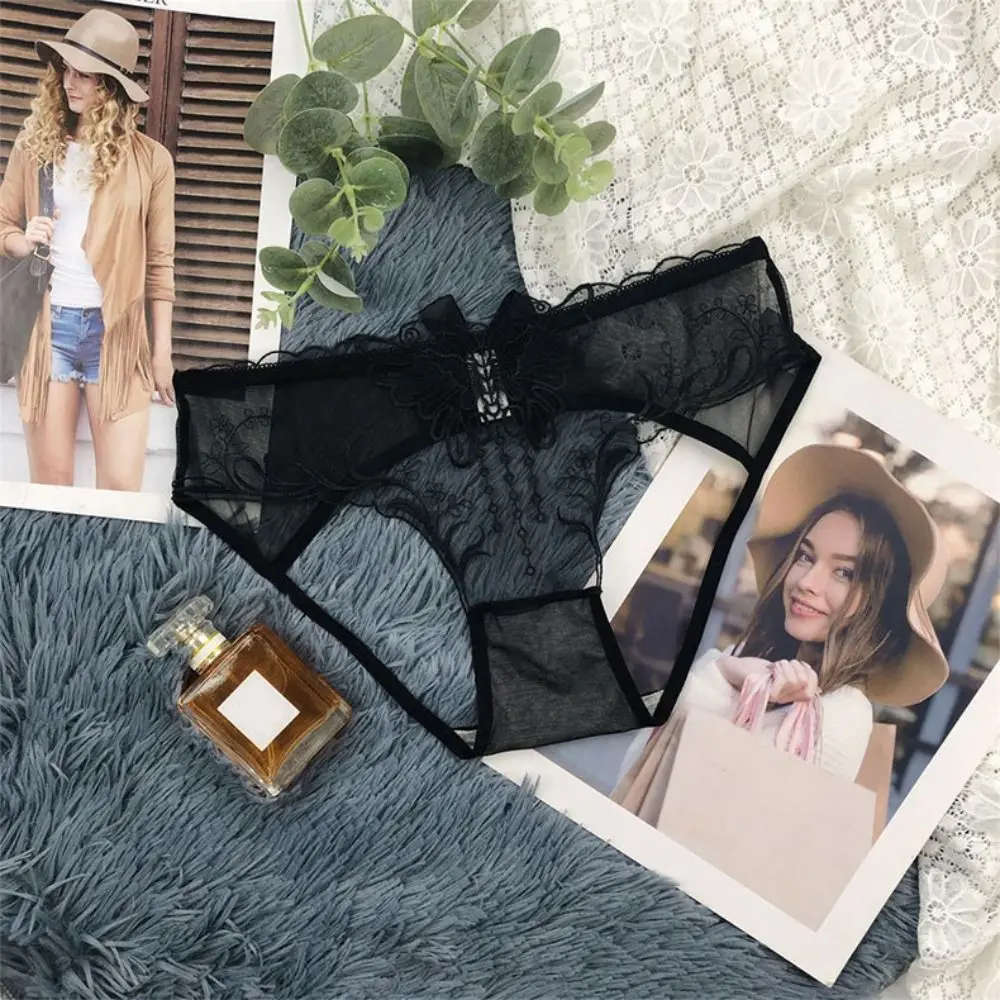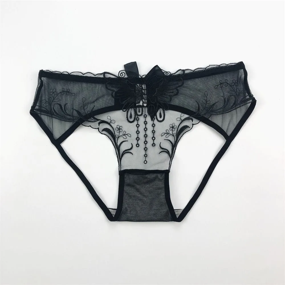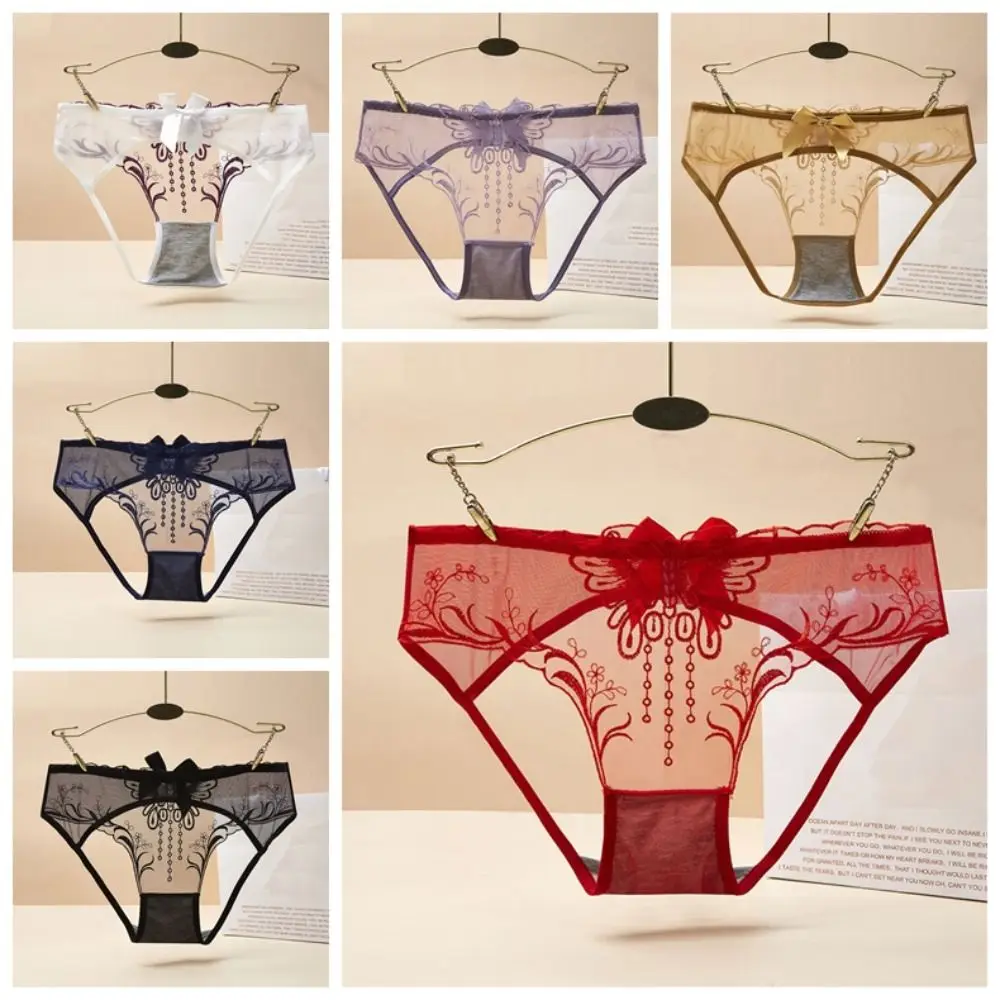 سراويل داخلية منخفضة الخصر بفيونكة دانتيل مجوفة ، شبكة زهور رقيقة من الأوراق ، سراويل داخلية شفافة ، ملابس داخلية بسيطة ، ثونغ بتطريز الفراشة