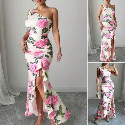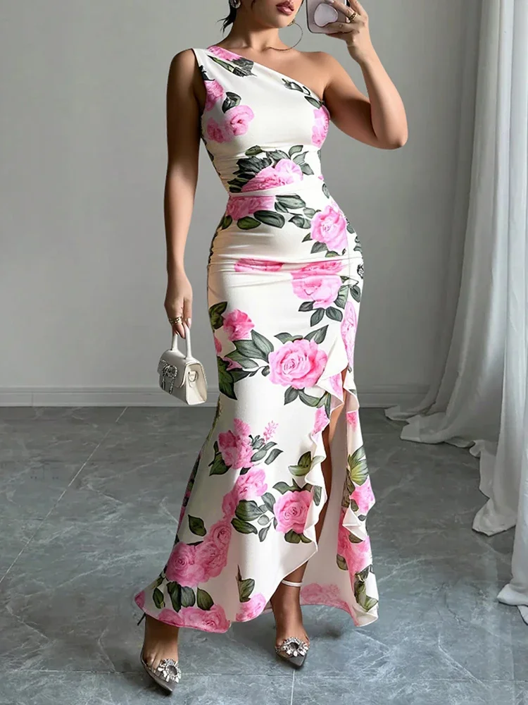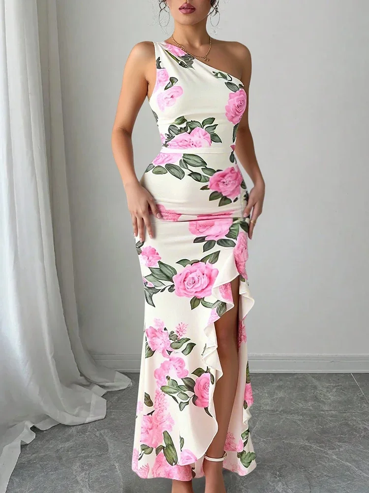 فساتين Rafiah Boutique النسائية الصيفية غير المتكافئة ذات الأزهار الأنيقة بدون أكمام بكتف واحد، فساتين سهرة نحيفة