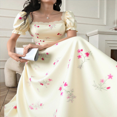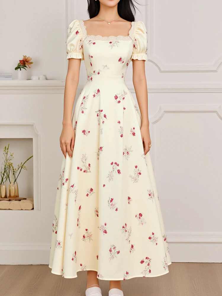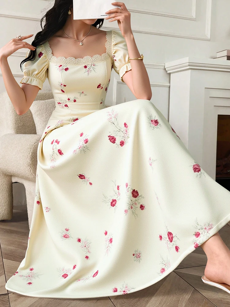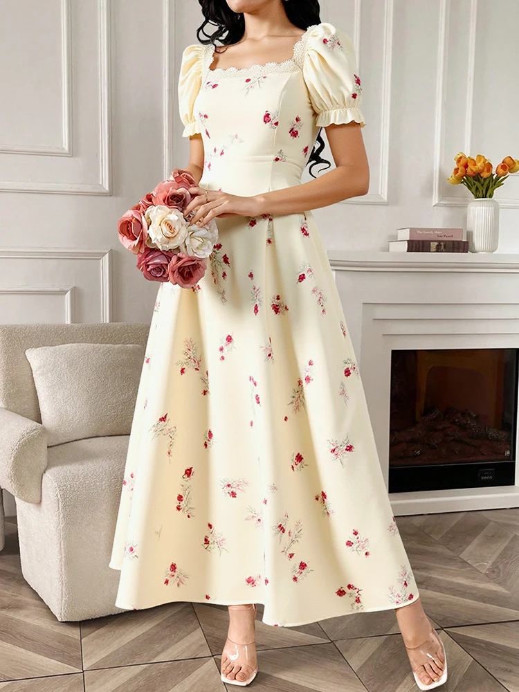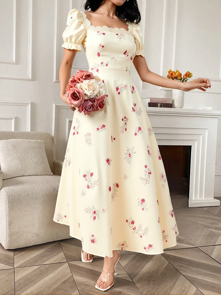 فستان صيفي نسائي من Rafiah أنيق أنيق مزين بالزهور وأكمام منتفخة ورقبة مربعة على شكل حرف a فساتين طويلة للمواعدة فساتين سهرة 2025